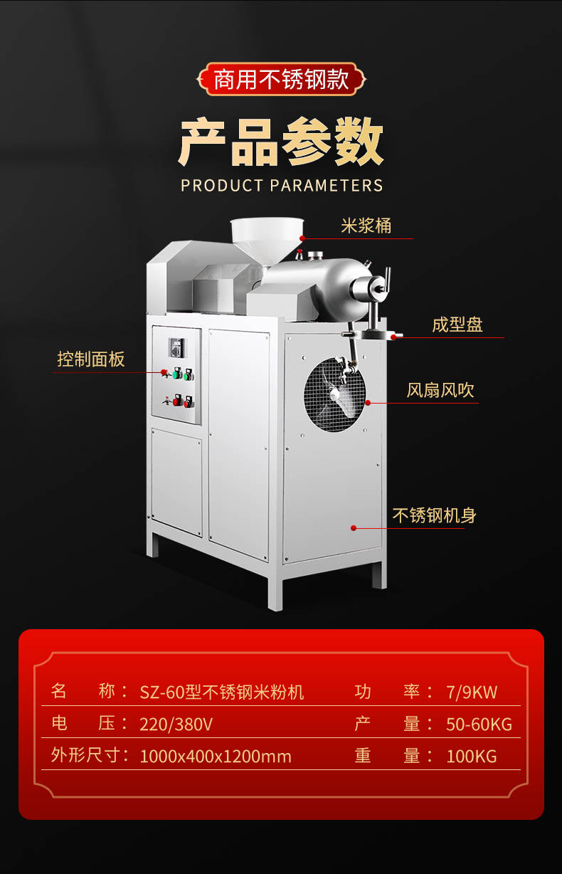 SZ-60不銹鋼米粉機(jī),可生產(chǎn)米粉、米線、桂林米粉、過(guò)橋米線、年糕、糍粑等產(chǎn)品。各種形狀都可生產(chǎn)(圓、扁),加工食品外表光滑,厚薄、寬窄、粗細(xì)均勻可調(diào),筋軟適度,有彈性,口感柔軟、味道純正。