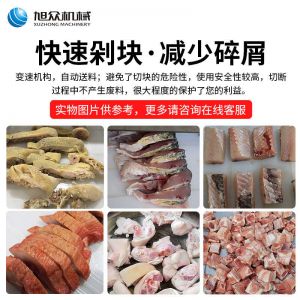 XZW-130禽肉類剁塊機,手工剁肉的煩惱人工切骨頭費時費力,效率低并且人工成本高,而且也是一個危險程度高的活,尤其是切大骨頭的時候,一不小心就會傷到手手工剁肉費時費力成本高。旭眾禽肉類剁塊機幫你解決手工煩惱每小時可剁切600公斤。