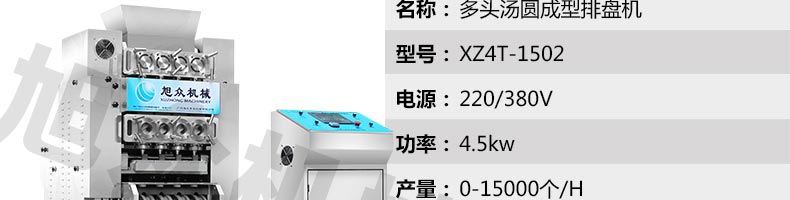 XZ4T-1501多功能搓圓擺盤機/湯圓機,本機只要將面團放入進料口,開機便可自動搓圓、成型的設備,一次性成型四次產品,制品不易變形,工作效率高,相當于15-20個工人同時手工制作湯圓,并可自動排盤,真正的低投入、高收效、省錢省工。
